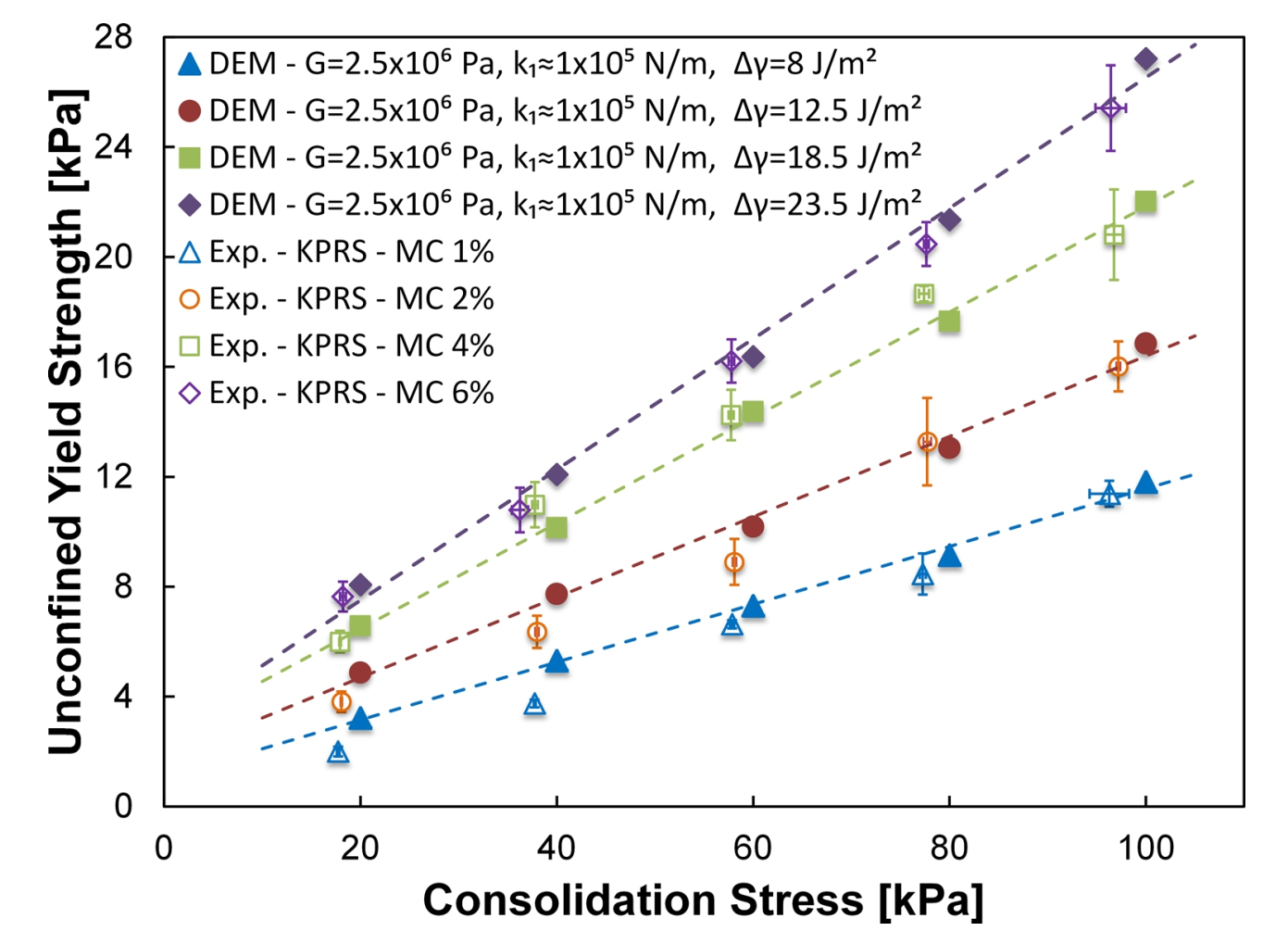 The EEPA contact model has been used to predict an experimental flow function of KPRS iron ore fines. The contact model has demonstrated the ability to capture the stress history dependent behaviour that exists in cohesive granular solids. The DEM simulations provide a very close match to the experimental flow functions, with the predicted unconfined strengths found to be within the standard deviations of the experimental results.