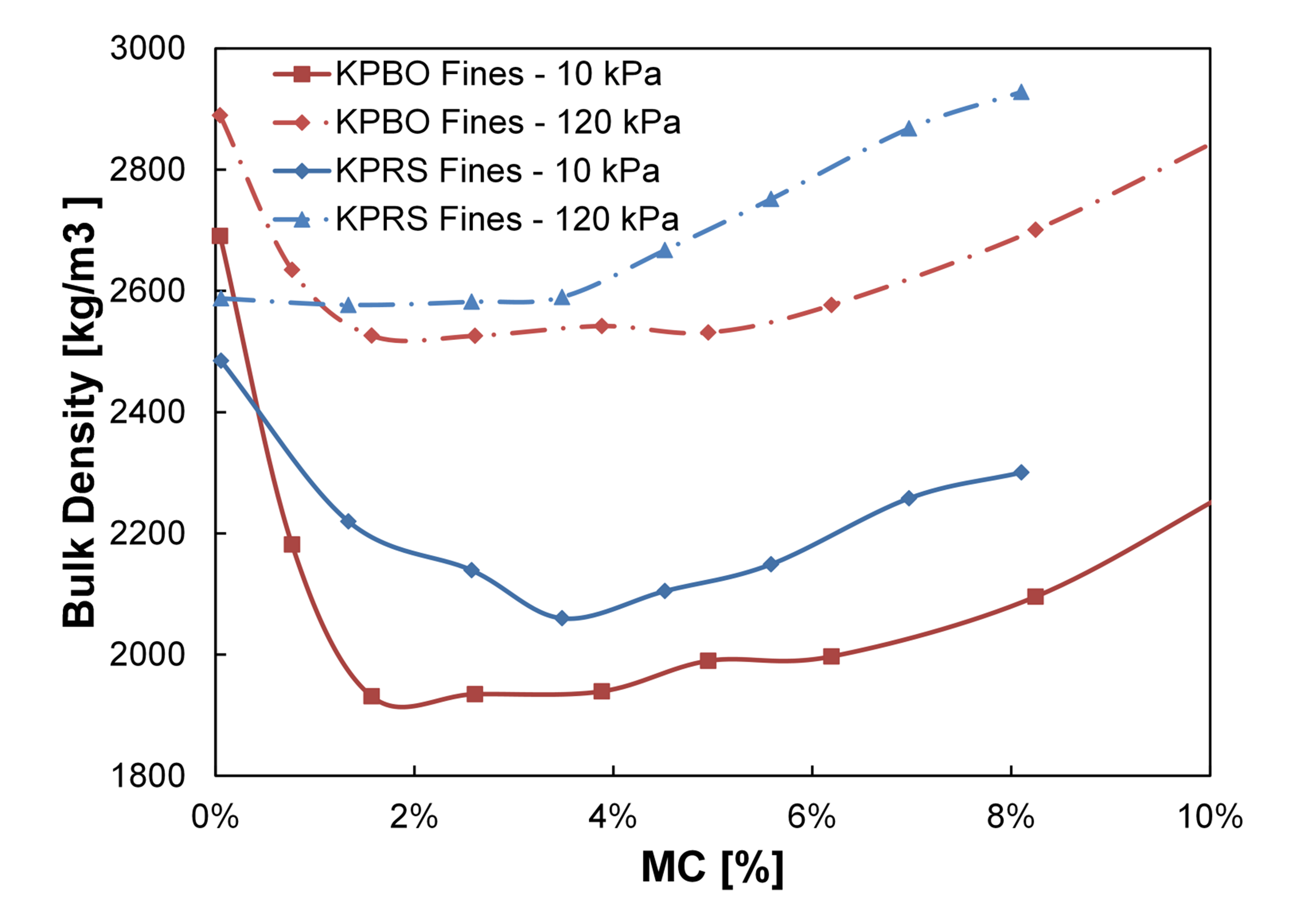 The addition of moisture to the sample has been found to have a significant effect on both kinds of fines. KPRS fines were found to have a much higher unconfined strength and flow function at higher moisture contents, and also show a greater increase in cohesion with the addition of moisture, while at moisture contents of less than 2% the KPBO fines demonstrate higher unconfined yield strength. The KPBO fines were also found to achieve a significantly looser initial packing at much lower moisture content when compared to the KPRS fines. The lateral pressure ratio has also been evaluated.